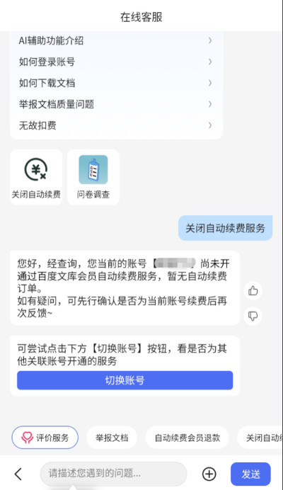 4、点击后会有智能客服帮助你关闭,如果之前没有开启自动续费的话,也会提示你当前账号未开启自动续费。