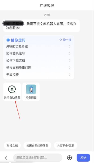 3、点击后进入在线客服界面后,会在对话框中直接出现【关闭自动续费】的选项,点击一下该选项;