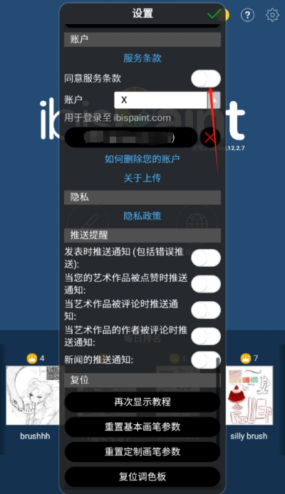 4、然后我们继续将该界面下拉,找到下方的【账号】功能位置,在这里会有一个【同意服务条款】的功能按钮,点击后面的开启即可;