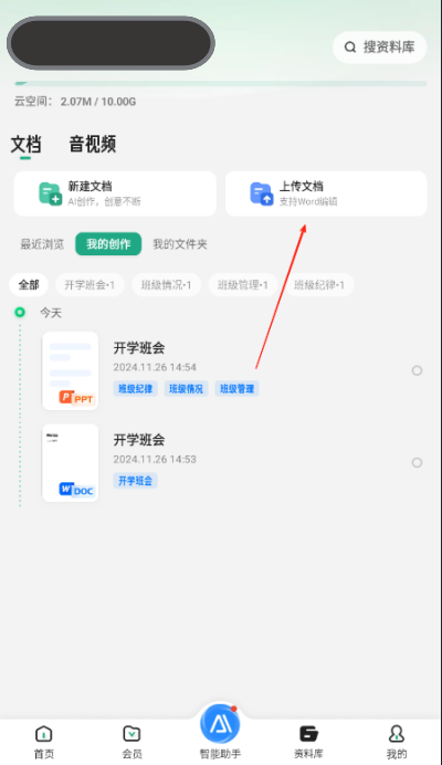 2、点击后进入资料库界面,在这里即可看到【上传文档】选项,点击该按钮进行上传;