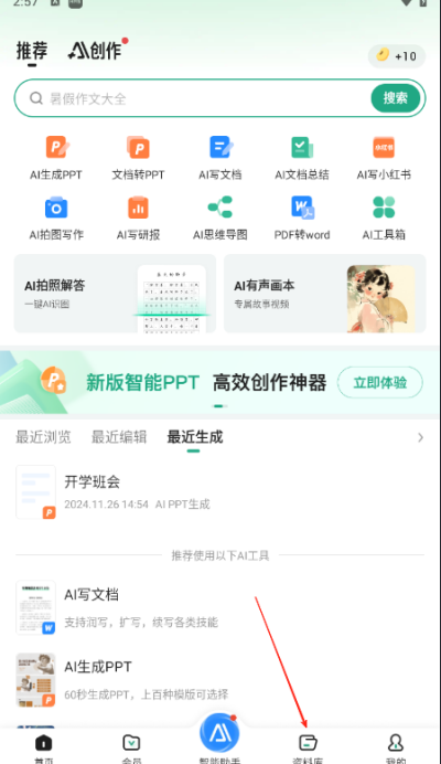 1、首先打开手机上的百度文库app,打开软件进入首页后,点击下方的【资料库】选项;