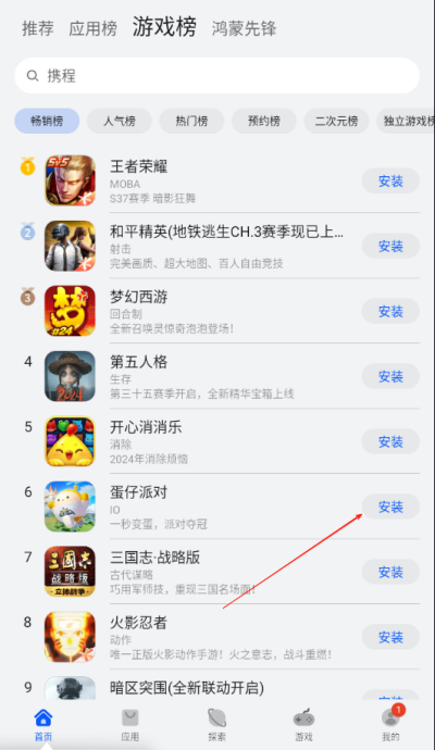 4、在游戏榜的畅销榜界面,在第六名的位置可以看到【蛋仔派对】,同样点击后面的安装选项即可将蛋仔派对下载到手机上。