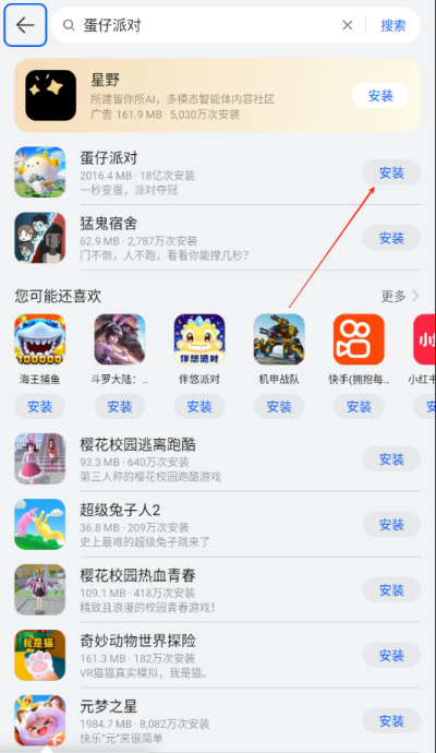 2、在搜索框的位置输入【蛋仔派对】然后点击后面的搜索,点击后即可看到相应的游戏结果,点击后方的【安装】即可下载到手机上;